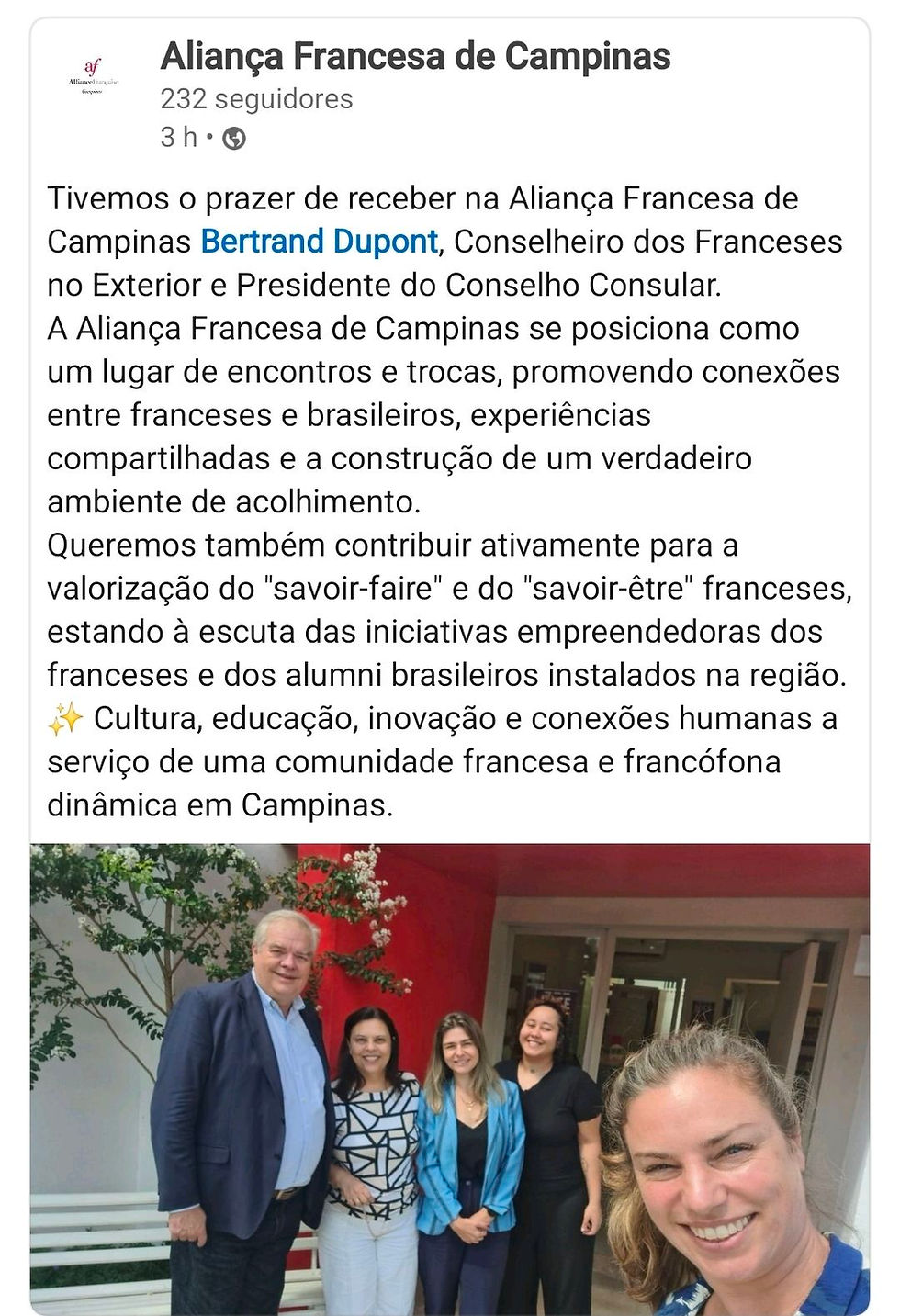 Merci également au Consul honoraire de France à Campinas, Alexandre Poupault, avec qui j'ai eu le plaisir d'échanger longuement sur les problématiques de nos compatriotes et les possibles partenariats dans cette région de l'État de São Paulo.